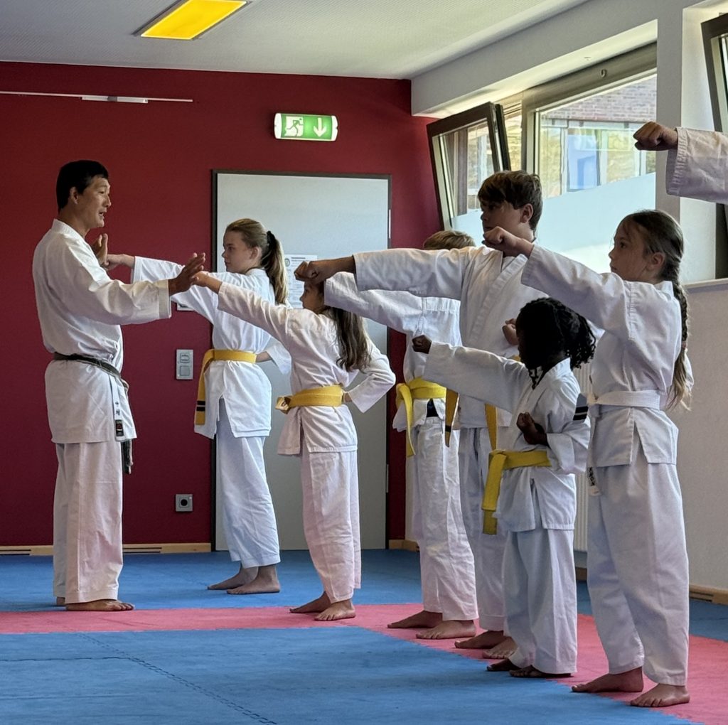 Beim ersten Training trainieren immer alle gemeinsam, Anfänger:innen und hochgraduierte Schwarzgurte, Kinder und Erwachsene. Danach wurde in Gruppen aufgeteilt (nach Grad des Fortschritts) und in den Gruppen weiter trainiert. Die Kinder hatten das Glück, in ihrer Gruppe noch einmal bei Sensei Tetsuji Nakamura zu trainieren, die Kinder waren begeistert!